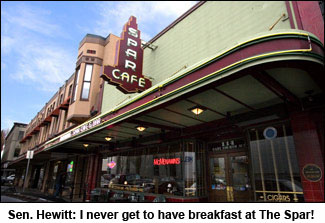 ► In today’s Olympian — Budget agreement may be days away — Budget writers in the state House and Senate were working into the evening to narrow their differences on a roughly $32 billion two-year operating budget, and leaders talked with a growing confidence that an agreement is near. … Senate Republican Leader Mike Hewitt says he also wants an agreement on real savings in workers’ comp, but he fumed that House Speaker Frank Chopp, who has been locked into meetings of late, was not available to negotiate on workers’ comp. Hewitt cited eyewitness accounts that Chopp had breakfast at The Spar restaurant with the Washington State Labor Council’s president, who opposes some of the workers’ comp reforms.