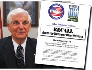The Pierce County Central Labor Council is hosting a Labor Neighbor-style walk this Saturday, May 21 from 10 a.m. to 2 p.m. to collect signatures in the effort to recall the county Assessor-Treasurer Dale Washam. Union members that want to participate in Saturday’s effort should meet at the IBEW Hall, 3049 S. 36th St. in Tacoma, at 10 a.m.