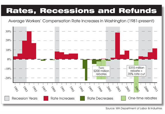 Perhaps these elected leaders consider the system’s instability to be a consequence of the recession, and not excessive benefits. Perhaps they have studied the history of rate increases and learned that recent hikes were actually less that those required in previous recessions. Perhaps they realized the system would be on far more solid footing today had rates not been lowered in pre-recession 2007 and a 6-month “rate holiday” granted, where employers and workers paid NOTHING for the medical portion of their insurance. That cost the system $315 million, or the 2007 equivalent of a 35% rate decrease. By comparison, the 12% rate increase in 2011 brought in $196 million.