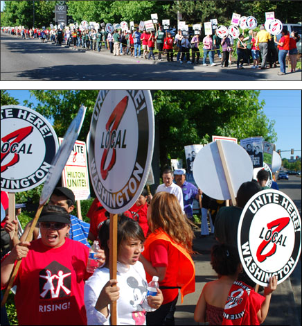 The picket represents the largest demonstration in SeaTac city history, as workers organize to demand their share of the economic recovery. It comes on the heels of a recent downtown Seattle rally on July 22 that gathered more than 600 people to support hotel workers.
