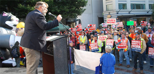 Jeff Johnson, President of the Washington State Labor Council, speaks at the Oct. 13 rally for Good Jobs Now at Seattle's Westlake Park.