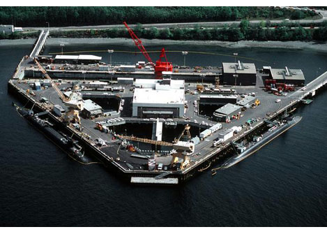 An aerial view of a section of the Delta Refit Pier at the Bangor Submarine Base showing two Ohio class nuclear-powered ballistic missile submarines tied up at the facility. (www.dodmedia.osd.mil)