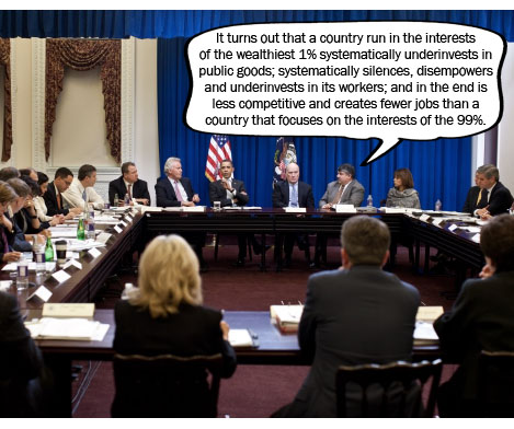 ► In today’s NY Times — Dissent in the Jobs Council (editorial) — Increasingly, Obama’s jobs council’s recommendations have resembled not so much expert advice as a corporate wish list. (AFL-CIO President Richard) Trumka wrote a dissent in which he agreed that the United States has fallen behind other countries in investment in infrastructure, manufacturing, education, job skills and alternative energy. What he rightly objected to was the idea that less regulation, lower corporate tax rates and other demands on the business agenda are the key to restoring competitiveness and creating jobs.