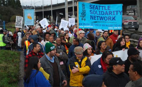 SEATTLE (Feb. 13) — About 300 port workers, faith leaders, and community members rallied in support of short-haul truck drivers — mostly immigrants from East Africa, Asia, and Eastern Europe — who are taking on the giants of the shipping industry over basic issues of safety and fairness. Together, they are calling on elected officials and the big shipping companies to do what it takes to ensure truck drivers at our seaport get the safe working conditions and fair treatment they deserve.