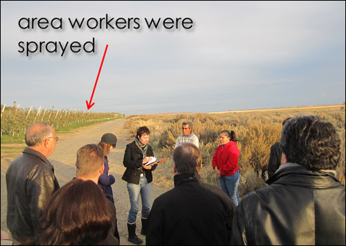State legislators tour a site on Nov. 3 near Mattawa where 59 farm workers were sprayed in 2010 by one aerial applicator. Workers and foremen waved their arms, made eye contact with the low-flying pilot, and were still covered in pesticide.