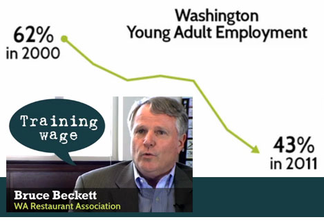 The video also features Bruce Beckett, a lobbyist for the Washington Restaurant Association, specifically advocating for a sub-minimum training wage. He says youth employment in Washington has “plummeted (and) it’s much beyond the recessionary impacts.”
