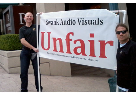 Swank Employees: You may have seen IATSE members bannering in front of the hotels where you work. We are not here to displace you. We are here to inform the public that your employer is not paying you a fair wage. If you, or anyone reading this, agrees that people should be put before corporate profits, please call Greg Diekemper at Swank Audio Visual corporate office, 877-792-6528, and tell Mr. Diekemper to pay his audio visual techs the area standard wage.