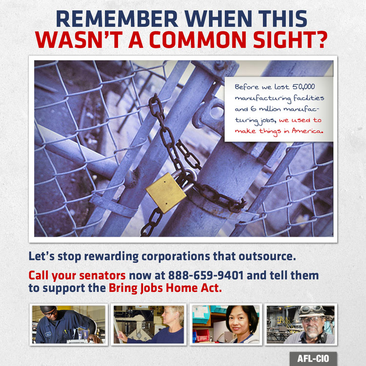 UPDATE (July 19) — from AFL-CIO Now — Senate Republicans say ‘Don’t Bring Jobs Home’— Given the choice between supporting American workers or the corporations that ship U.S. jobs overseas, Senate Republicans sided with the job exporters last Thursday and blocked a vote on the Bring Jobs Home Act. Republicans filibustered to block the measure; a 56-42 vote fell just four votes of the 60 required to advance the legislation. (Both Sens. Maria Cantwell and Patty Murray voted in favor of the bill.)