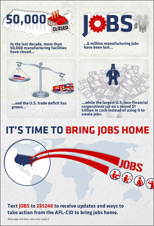 That is what the AFL-CIO’s Bring Jobs Home campaign is all about: calling attention to the offshoring of American manufacturing, and urge our elected leaders to support trade, tax and other policies that create jobs right here.