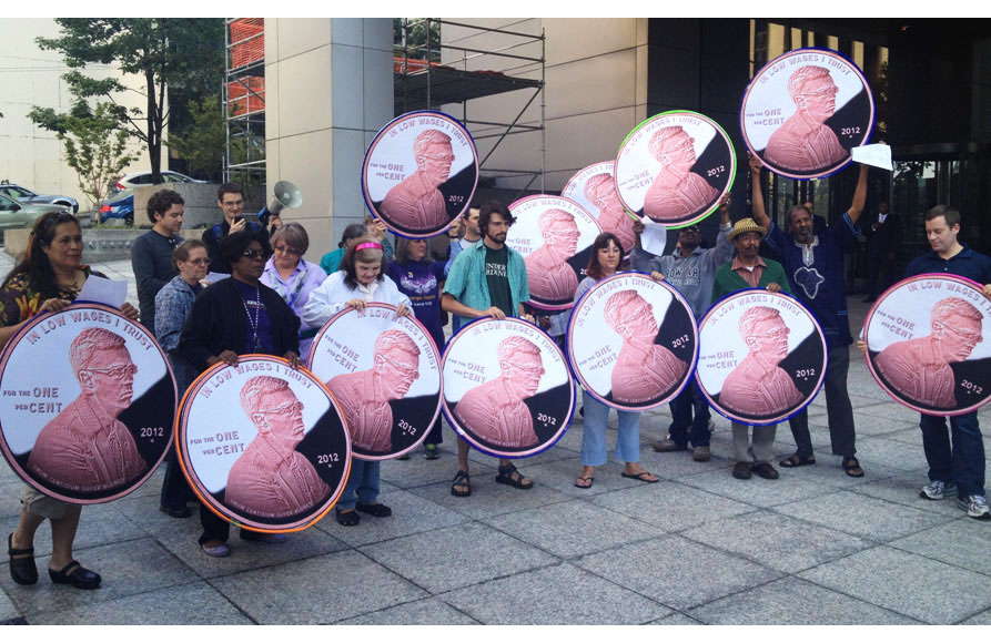 SEATTLE — Low-wage workers and community supporters gathered outside Republican gubernatorial candidate Rob McKenna’s Attorney General’s office in Seattle on Tuesday, giant McKenna-faced pennies in hand, to give him their “two cents” about their struggles to make ends meet while McKenna has opposed a small increase in the minimum wage.