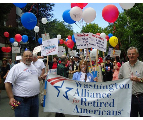 SEATTLE — To mark the 47th birthday of Medicare and Medicaid, area retirees with the Washington Alliance for Retired Americans, Physicians for a National Health Program and community allies celebrated in full force in downtown Seattle on Saturday, July 28 with a sidewalk parade from the Seattle Center through Pike Place Market to Victor Steinbrueck Park with music and street theatre.