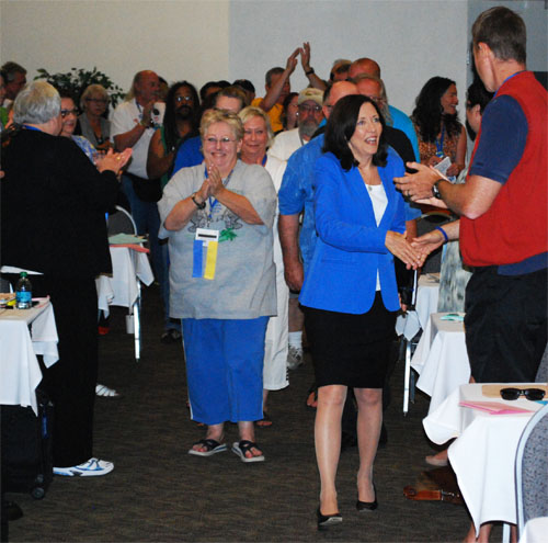 Sen. Maria Cantwell received a raucous ovation from delegates as an escort committee brought her to the convention stage on Wednesday.