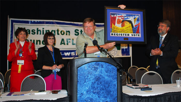 The Power to the People Award for outstanding political advocacy was presented to Phil Lindquist of the International Union of Painters and Allied Trades, District Council 5. He accepted a challenge posed in the spring by WSLC Political Director Karen Deal to create the most successful rank-and-file voter registration program possible, and was presented the award for his outstanding efforts.