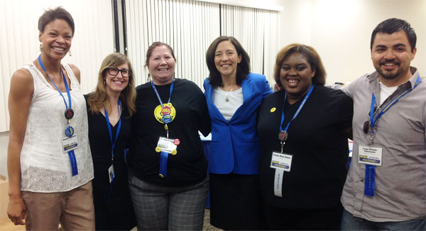 After WA YELL’s 1st Annual Convention, (from left) Kamaria Hightower, Justine Winnie, Elaine Carlson, U.S. Sen. Maria Cantwell, Tasha West Baker, and Jorge Antonio Valenzuela.