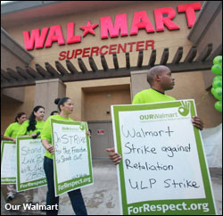 ► At Salon.com — Walmart strikes spread to more states — For the second time in five days — and also the second time in Walmart’s five decades — workers at multiple U.S. Walmart stores have walked out on strike. Tuesday morning, workers walked off the job at stores in Seattle, Dallas, Miami, Laurel, Md.; and in Northern, Central and Southern California. Both walkouts were spearheaded by OUR Walmart, a year-old organization of Walmart workers backed by UFCW. The group is calling for improved staffing and benefits as well as an end to alleged retaliation against its members.