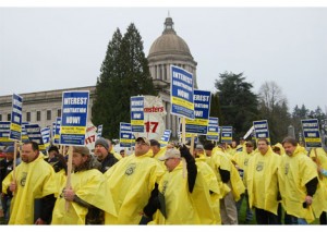 Waving signs reading “Interest Arbitration Now!” and chanting “Teamster Power,” prison workers from 12 Washington state institutions, many of whom traveled on buses from cities as far away as Monroe, Walla Walla, Spokane, the Tri-Cities, and Clallam Bay to attend the event, marched around the State Capitol before assembling on the Capitol steps.