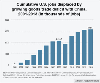 As a result, EPI calculated that between 2001 and 2013, the United States lost 3.2 million jobs. Every state and every Congressional district except one lost jobs because of ever rising imports from China that were not matched by exports from the United States.