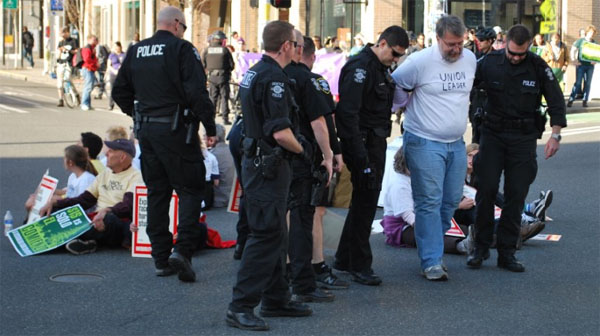 In Seattle, the day’s action culminated in the occupation of a Seattle University building, where hundreds chanted “count the votes,” urging the school’s administration to end its court appeals against the universities’ adjunct professors freedom to form unions and count the ballots in their union election, as ordered by the National Labor Relations Board. After leaving the building, hundreds shifted the protest to a nearby intersection where 21 workers, students, and community leaders — including Washington State Labor Council President Jeff Johnson (below) — were arrested for civil disobedience.