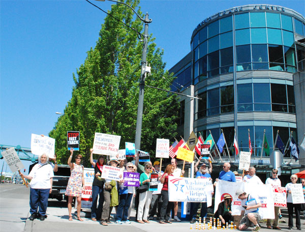 SEATTLE (May 29, 2015) — Dozens of advocates for fair trade policies and the Medicare program joined together Thursday to protest a proposal from Rep. Dave Reichert (R-8th) to raid Medicare funds to help finance assistance for workers whose jobs are moved overseas in the wake of the proposed Trans-Pacific Partnership (TPP) trade agreement and other NAFTA-like deals.