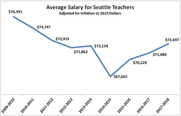 In fact, the average the average teacher salary in Seattle fell by $4,470 just from the 2013-2014 school year to the 2014-2015 school year. This year average teacher compensation was $8,728 less than it was in 2010. All told, teachers lost $22,600 over the past six years compared to their salaries in 2009. And while they got an increase in their contract, they will still be $4,000 short of what they earned in 2009, doing the same work.