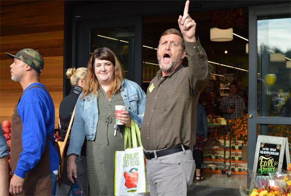 As the rally came to a close, participants attempted to engage the chain’s top executives — all present for the store opening — about community concerns and worker rights. The managers, however, were not so “friendly,” screaming at rallygoers (see photo) and refusing to speak with Robby Stern, president of Puget Sound Advocates for Retirement Action.