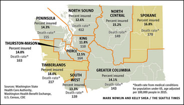 ► In today’s Seattle Times — Washington state’s sickest regions would take biggest hit if Obamacare is repealed — A repeal of Obamacare would hit Washington hard — but nowhere harder than in parts of the state where people are the sickest. The Affordable Care Act (ACA) — better known as Obamacare — vastly expanded Medicaid enrollment by extending elligibilty to low-income people under age 65. Washington is one of 31 states, plus the District of Columbia, that had adopted the Medicaid expansion. Here in Washington, data show that regions with the highest percentage of people under 65 with insurance made possible by ACA are in rural areas where people are more likely to die from disease at a relatively young age.