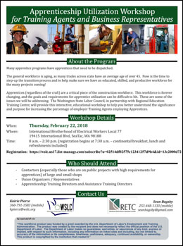 SEATAC (Jan. 11, 2018) — The Washington State Labor Council, AFL-CIO, in partnership with the Regional Education and Training Center, is hosting an educational workshop to help contractors, apprenticeship directors, and union organizers/representatives better understand the significance and purpose for increasing the percentage of employer Training Agents employing apprentices. It will be from 8 a.m. to 2:30 p.m. on Thursday, Feb. 22 at the IBEW Local 77 Hall, 19415 International Blvd. in SeaTac.