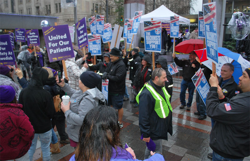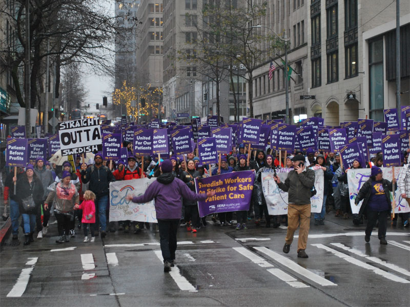 SEATTLE (Jan. 29, 2020) — Striking nurses and frontline caregivers at Swedish-Providence hospitals in the greater Seattle area got a big dose of union solidarity Wednesday when more than 1,000 strikers and their supporters marched through downtown Seattle and rallied together. They delivered a loud message that Swedish management needs to do something about chronic understaffing and to put patients before profits.