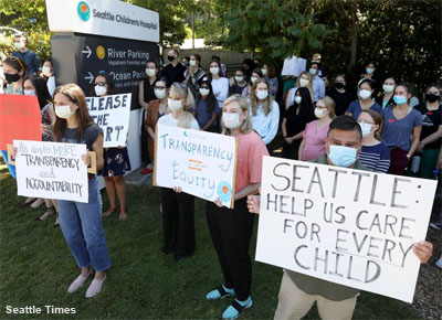 ► From the Seattle Times — Seattle Children’s staff call for full report from probe into racism at hospital system — Seattle Children’s leaders face continued fallout from how they handled an external investigation into racism within the hospital system, as some staff and community members are calling for further transparency and even the resignation of top leaders. On Wednesday, around 100 employees staged a one-hour walkout on the main campus in Laurelhurst, calling for the release of the full investigative report. Protests were also planned outside three other hospital locations.