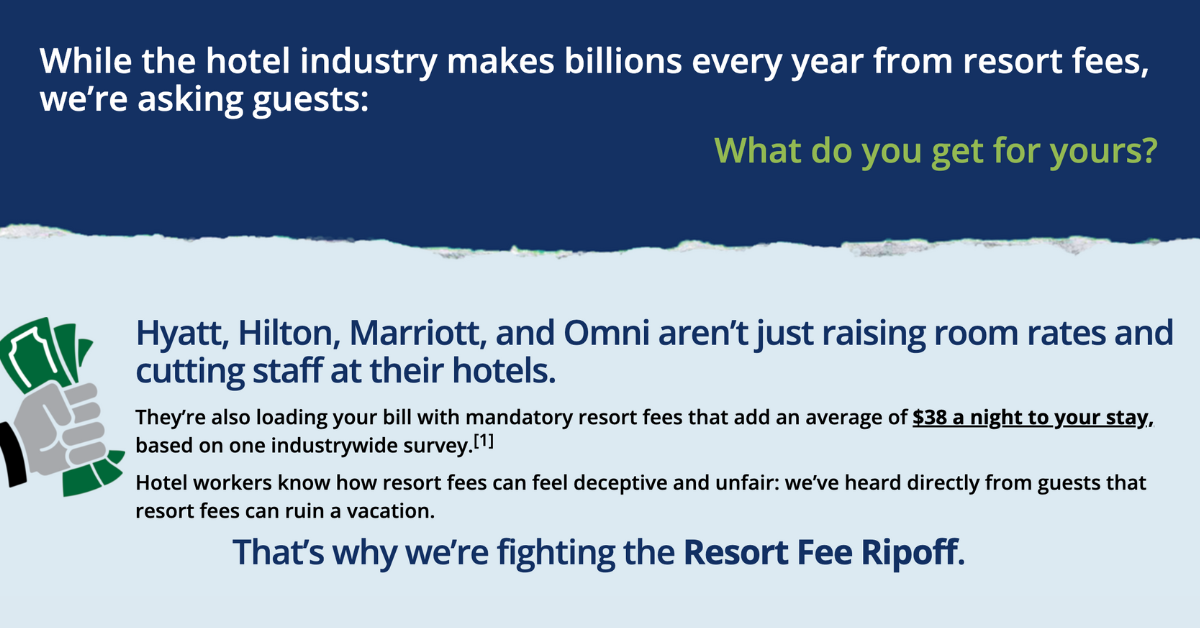 ► From Business Wire — Following Labor Day Strikes, UNITE HERE Launches “Resort Fee Ripoff” Website — Hyatt, Hilton, Marriott, and Omni face customer complaints, press scrutiny, and legal actions as a result of their resort fee policies. “While hotel workers are struggling for higher wages and fair workloads, rising fees and hotel service cuts are hurting guests too,” said Gwen Mills, President of UNITE HERE. “The future direction of the American hotel industry, and the standards that guests have come to expect, are on the line.”