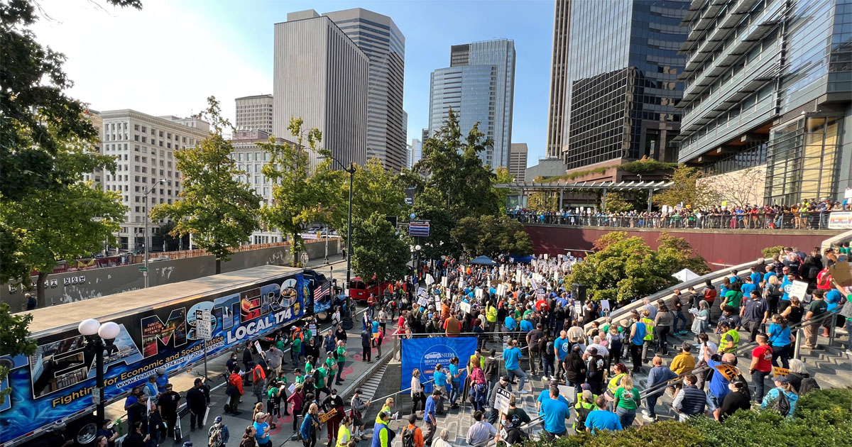 City of Seattle workers rallying for a fair contract in 2023. Photo: WSLC