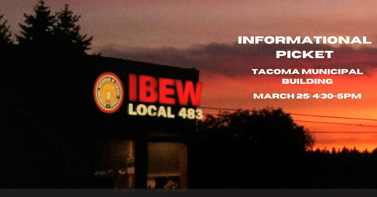TAKE A STAND: Join IBEW Local 483 electricians for an informational picket today, Tuesday, March 25 from 4:30 to 5:00 p.m. at the Tacoma Municipal Building (747 Market St, Tacoma, WA 98402).
