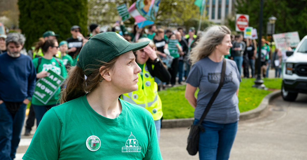 Mïlo Nicholas, pictured at a rally for state employees they helped plan, is a WFSE Local 443 vice president and shop steward. Photo: Mïlo Nicholas