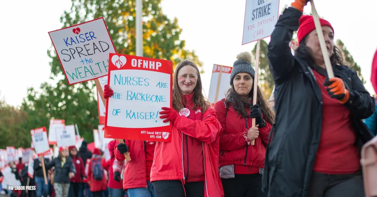 ► From the NW Labor Press — Kaiser Permanente workers on strike in four states — Strikers see pay increases as part of the solution to staff shortages that are affecting quality of care. “When we speak up about patient safety, about preventing clinician burnout, we’re met with silence,” said striking physician associate Josh Oppenheim at an Oct. 14 rally outside Kaiser’s Sunnyside Medical Center. “And that silence is deafening.”