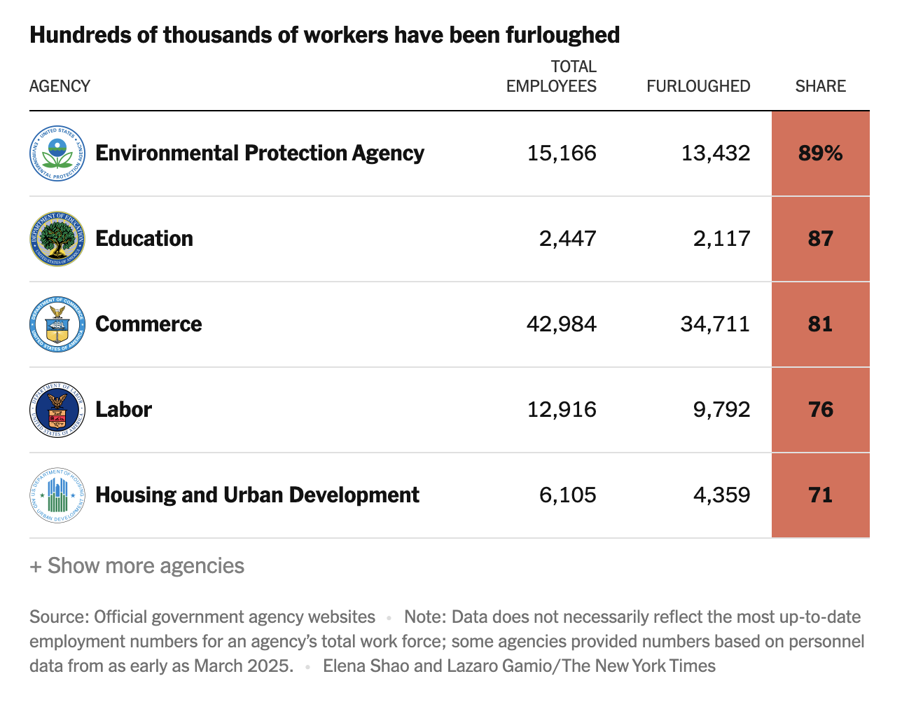 A graphic from the New York Times details the hundreds of thousands of workers furloughed. Source: www.nytimes.com/interactive/2025/09/30/us/politics/government-shutdown-furloughs.html