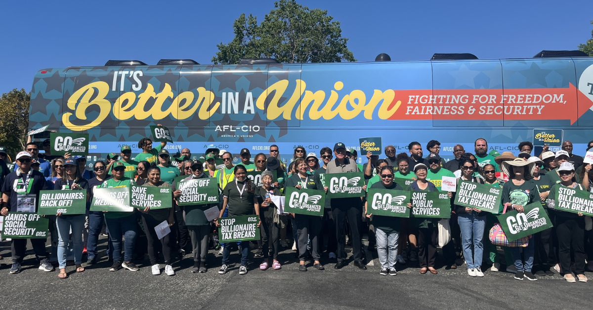 AFSCME members at a stop on the AFL-CIO’s summer bus tour highlighting the ways Trump’s Project 2025 is harming working people. Photo: AFSCME