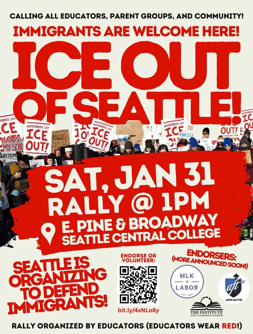 SEATTLE, WA (January 29, 2026) — As outrage over violent immigration enforcement continues to grow nationwide, educators in Seattle will gather for an action at Seattle Central College on Saturday, protesting ICE’s presence in the city. The rally is planned by educators, and endorsed by MLK Labor, the Washington Education Association, the Seattle Education Association, and AFT Local 1789, which represents Seattle community college faculty.