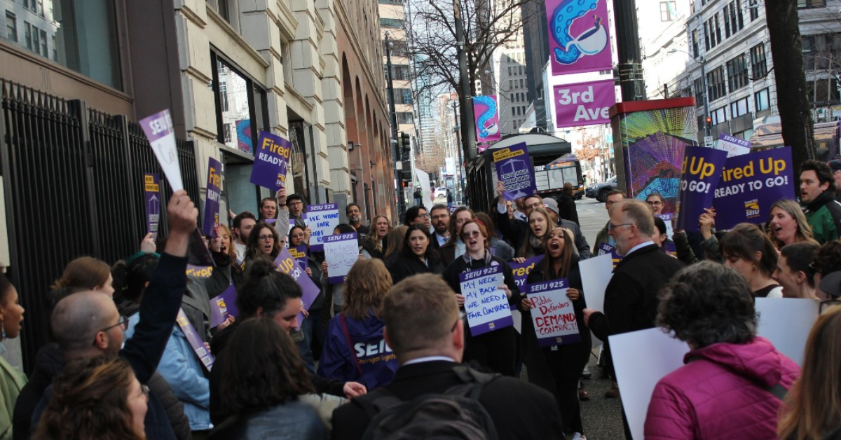 King County workers hit the streets Wednesday in Federal Way, Renton, and downtown Seattle, raising awareness of their ongoing fights for fair contracts. Public defenders and support staff marched marched from their offices in downtown Seattle and then over to the courthouse to demand King County take seriously their concerns about caseloads and staffing ratios. King County Parks staff protested outside the County’s Aquatic Center in Federal Way. These workers have not received wage increases, outside of basic annual cost-of-living adjustments, in 15 years, per their union, SEIU Local 925. And wastewater treatment workers picketed in Renton outside King County’s South Plant. Per the union, workers want to protect their leave and sick time, particularly important as workers who are routinely exposed to hazardous waste and sewage, and secure competitive wages.