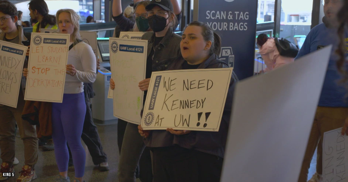 ► From the UW Daily — UW graduate student questioned and detained at Sea-Tac, removed from United States — “Basically, within the last 24 hours, this graduate student was on a visa,” UAW 4121 president Natalie Wellen said. “Everything seemed fine, but something happened at Sea-Tac when this graduate student was detained and the visa was revoked.” According to Wellen, the graduate student received a call instructing them to collect luggage from a location separate from baggage claim –– they were then detained…Wellen also said that UAW 4121 has called on the university and local elected officials to support the reinstatement of the graduate student. “By having a community network, then we can ensure that those who are currently making these calls to try and take away people’s rights, know that it can’t happen without a fight,” Wellen said.